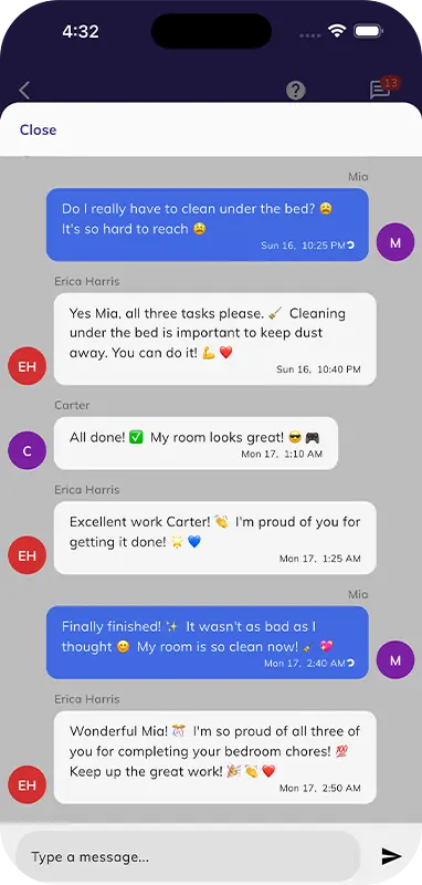 Keep your family connected and communicating effectively with Chore Chat, a feature designed to facilitate conversations about specific tasks and household responsibilities. Whether someone needs help, has a question, or deserves praise, Chore Chat keeps everyone in the loop.