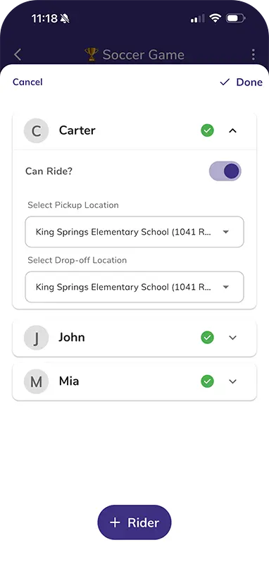 Koordinieren Sie Fahrten für Ihre gesamte Familie mit Kid Hop's erweiterten Mitfahrer-Management-Funktion, die für mehrere Kinder und verschiedene Zeitpläne entwickelt wurde: