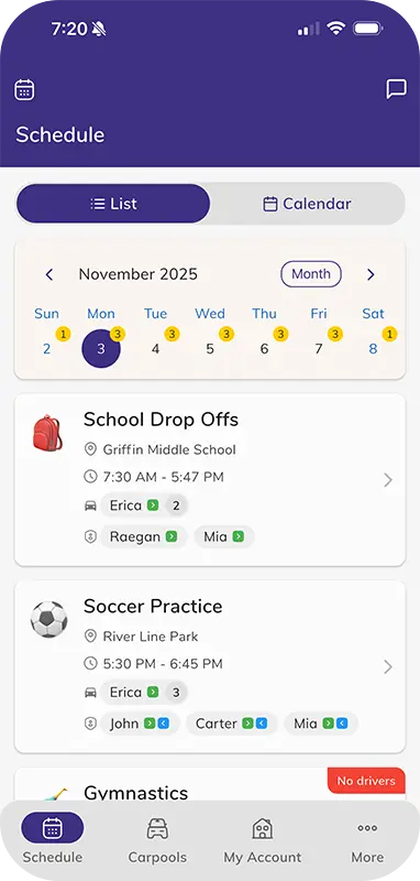 The Daily List View is your go-to screen for understanding today's schedule. Instead of flipping through calendars or searching for information, everything you need is in one scrollable list, organized by time. See immediately if there are any problems, like missing driver assignments, and take action before it becomes urgent. Parents love having all the day's details in one place, from morning dropoff through evening activity pickups, with real-time updates as situations change.