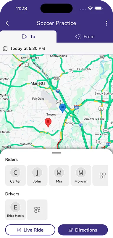 Keep everyone in sync with Kid Hop's new Live Ride feature, giving you real-time visibility of your carpool's journey: